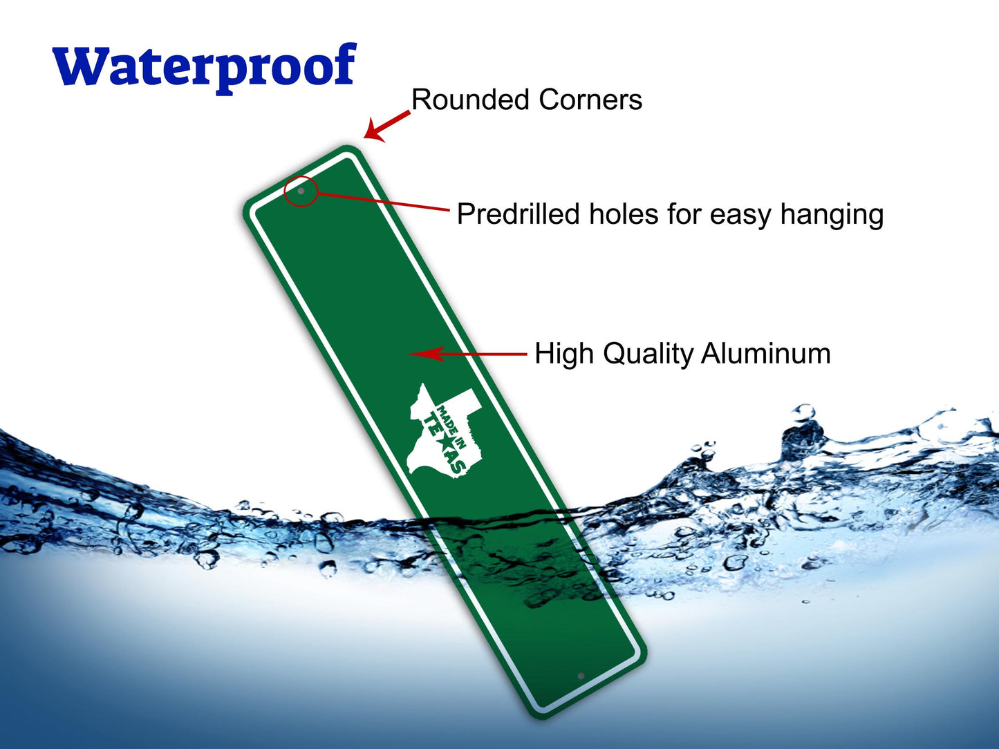 Our signs are printed in Houston,TX they are made of heavy gauge UV resistant aluminum. The images are printed onto the aluminum, and are weatherproof. Any rust or scratch marks is part of the design and not actual rust. All street signs will come with 2 predrilled holes for easy hanging.